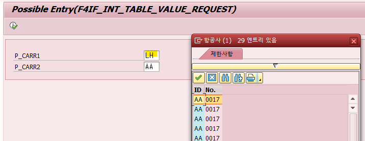 * p_carr1 파라미터에 대한 F4 도움말 로직 ('AA' 데이터 조회)