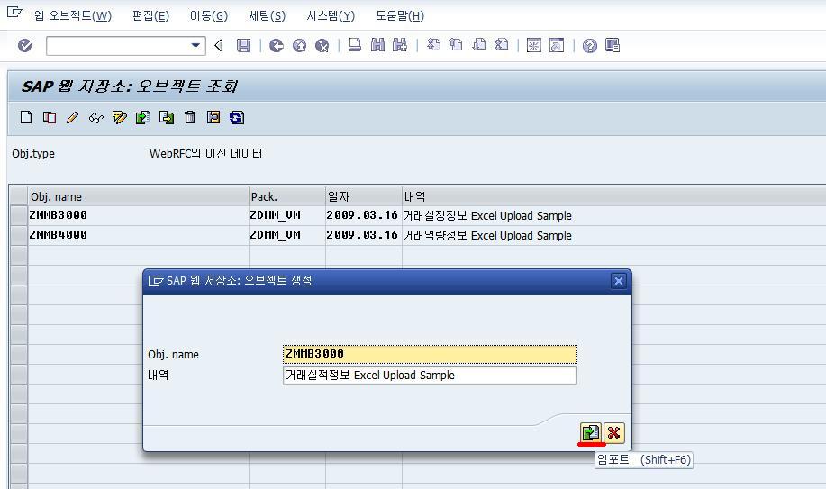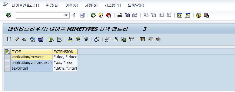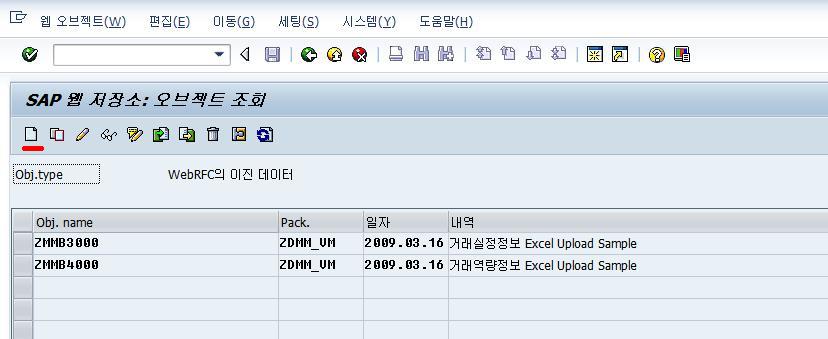 SAP 웹저장소(SMW0)를 이용한 문서연결 Posted: 2009-03-16/Under: ABAP/By: Donghoon Woo 저같은 경우엔 파일 업로드 양식을 올려두는데 사용합니다. BDC나 Excel Upload할때 문서양식을 찾지않고 프로그램에 바로 연결해서 쓰면 편하죠. 1. SMW0에 문서저장하기. 요건 문서등록전에 해mime type 추가해준 화면(ms-word, ms-excel). 그리고 이렇게 문서를 등록. 2. 이젠 프로그램에 버튼추가